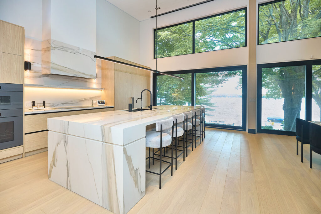 - A generous island with stools acts as a social magnet, drawing people to a central gathering spot. Make your island a feature by selecting a colour and/or material that contrasts with the rest of your kitchen cabinetry.