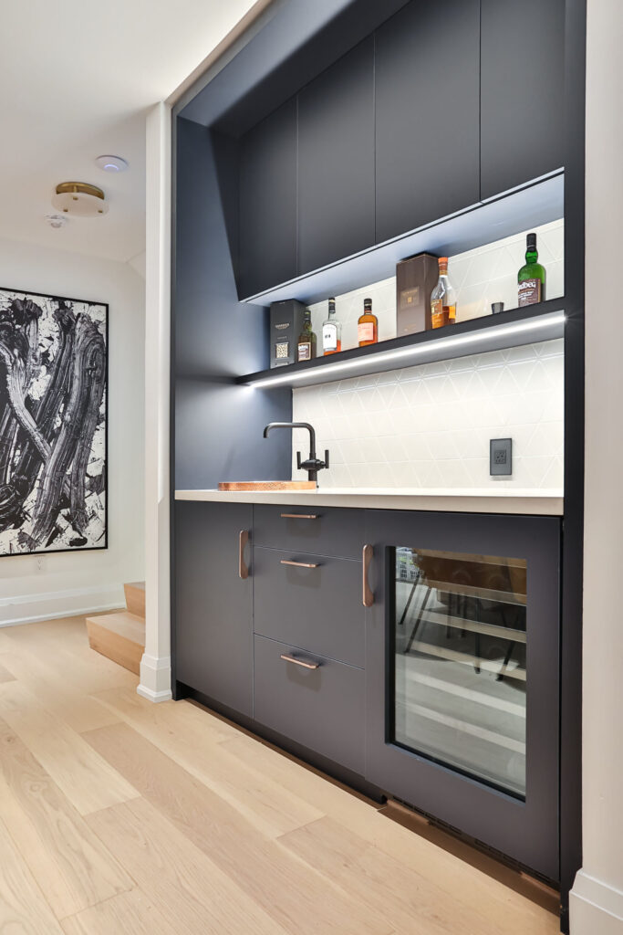 - Bevvie stations always start with a wine or beverage fridge. Not only does it keep beverages handy for social kitchens, but it adds a touch of hospitality. Position this fridge away from your main prep/cooking areas (i.e. end of kitchen island facing towards living room or at the end of a run of cabinetry), so guests can help themselves without getting in the way of the chef.